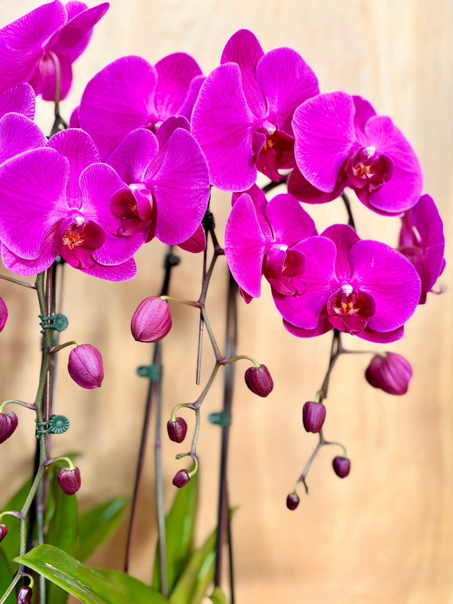 Elevate your décor with the deep, rich tones of our Magenta Orchid Luxe arrangement. This sophisticated piece features premium Phalaenopsis blooms artfully arranged in a rustic-chic boat planter. The clean lines and bold color deliver an immediate touch of elegance