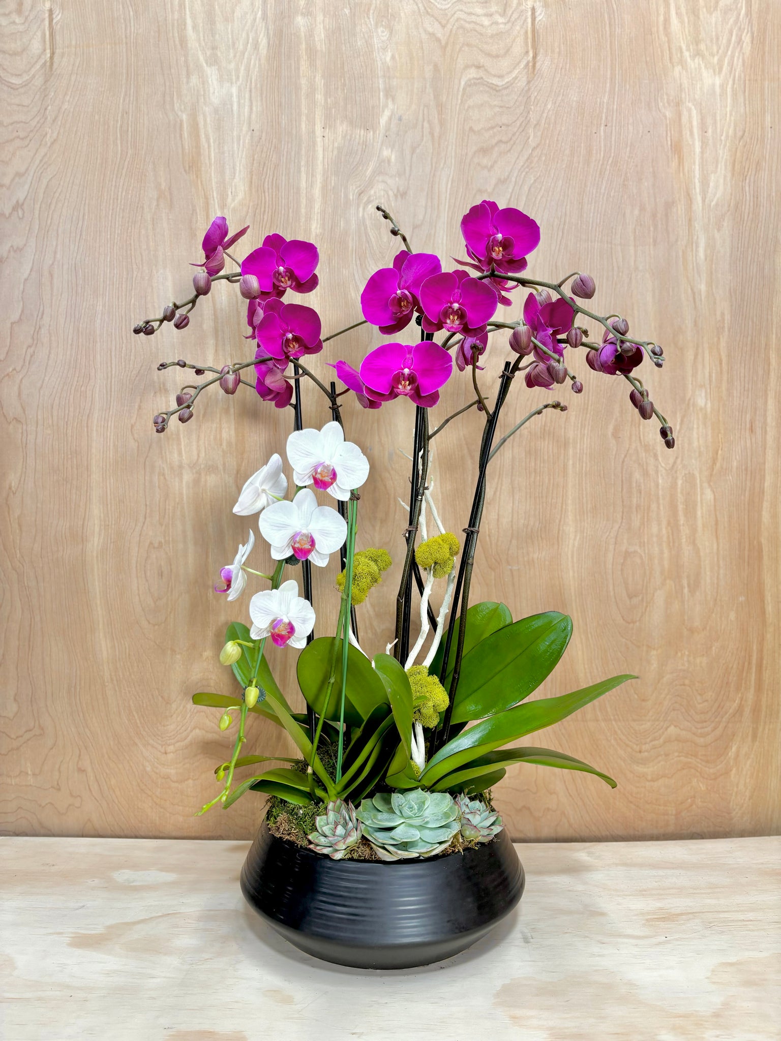 A stunning contrast of vibrant Magenta and crisp White orchids, potted with succulents. This sophisticated display sits in a modern Black Lined Ceramic Pot, emphasizing the vivid colors. The perfect luxury statement piece for any contemporary setting
